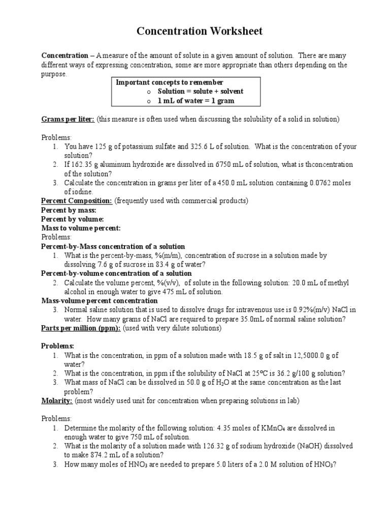 Concentrations Worksheet With Main Formulas On Top Pdf Parts Per Notation Concentration